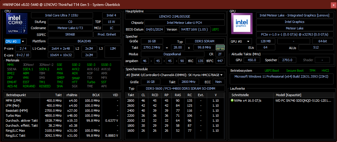 | Lenovo ThinkPad T14 G5 21ML005JGE Ultra 7 155U, Graphics 4-Core iGPU (Arrow Lake), WD PC SN740 SDDQNQD-512G-1014, IPS LED, 1920x1200, 14" | Lenovo ThinkPad T14 G4 21HD0043GE i5-1335U, Iris Xe G7 80EUs, Kioxia BG5 KBG5AZNV512G, IPS-AHVA LTPS wLED, 1920x1200, 14" | HP EliteBook 845 G10 5Z4X0ES R7 7840U, Radeon 780M, WD PC SN740 512GB SDDPNQD-512G, IPS, 1920x1200, 14" | Dell Latitude 7440 i5-1345U, Iris Xe G7 80EUs, Samsung MZ9L4512HBLU-00BMV, IPS, 2560x1600, 14" | Framework Laptop 13.5 Ryzen 7 7840U R7 7840U, Radeon 780M, WD PC SN740 512GB SDDPNQD-512G, IPS, 2256x1504, 13.5" | Lenovo ThinkPad T14 G4 21K4S02000 R7 PRO 7840U, Radeon 780M, Samsung PM9A1a MZVL21T0HDLU, IPS LED, 1920x1200, 14" | Durchschnittliche Intel Graphics 4-Core iGPU (Arrow Lake) | Durchschnitt der Klasse Office | |