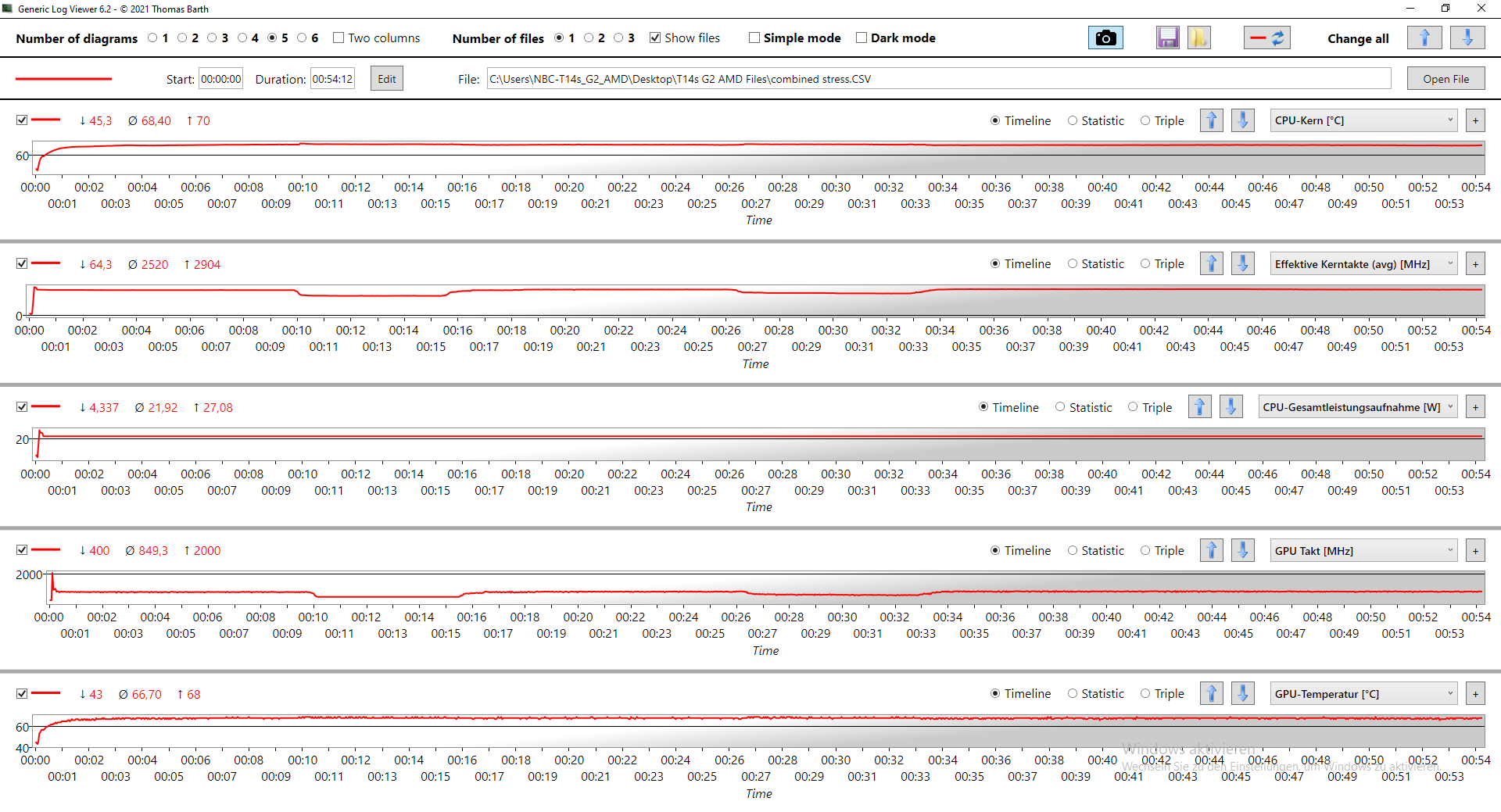Initial verbraucht der Prozessor im Prime95-Stresstest 22 Watt. Gegenüber dem Schwestermodell schafft es das T14s hingegen auch nach einer Stunde nahezu die doppelten Taktraten (bei doppelten Kernen) aufrechtzuerhalten: 8x 2,3 bis 2,6 GHz. Die Kern-Temperaturen liegen in dem Szenario bei rund 68 °C. Unter kombinierter Last arbeitet die GPU mit 900 MHz und drosselt zu keiner Zeit weiter. Die Temperatur beträgt sehr gute 67 °C.