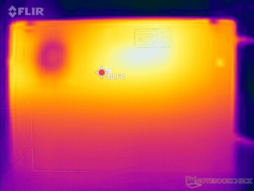 Die Temperaturen bewegen sich in sehr kühlen Gefilden. Bei kombinierter Last (Prime95 + FurMark) wird nur der Bereich am Lüfterauslass warm. Lediglich wenn man gleichzeitig auch noch den Akku schnell-lädt, wird es etwas heißer auf der unteren Geräteseite, hinten wo der Akku sitzt, sowie auch im hinteren Bereich der Tastatur. In Realität trifft dieses Szenario aber wohl nicht ein.