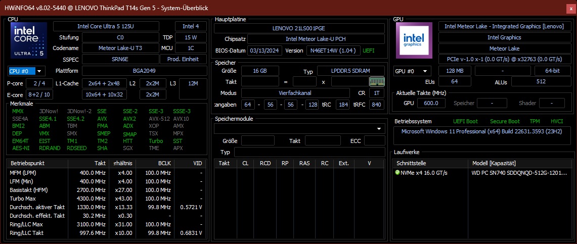 | Lenovo ThinkPad T14s Gen 5 21LS001PGE Ultra 5 125U, Graphics 4-Core iGPU (Arrow Lake), WD PC SN740 SDDQNQD-512G-1014, IPS LED, 1920x1200, 14" | Lenovo ThinkPad T14s G4 i7-1365U i7-1365U, Iris Xe G7 96EUs, , IPS, 1920x1200, 14" | HP EliteBook 845 G10 5Z4X0ES R7 7840U, Radeon 780M, WD PC SN740 512GB SDDPNQD-512G, IPS, 1920x1200, 14" | Asus ExpertBook B9 B9403CVA-KM0153X i7-1355U, Iris Xe G7 96EUs, Samsung PM9A1 MZVL21T0HCLR, OLED, 2880x1800, 14" | Dell Latitude 7440 i5-1345U, Iris Xe G7 80EUs, Samsung MZ9L4512HBLU-00BMV, IPS, 2560x1600, 14" | Lenovo ThinkPad T14s G4-21F8002TGE R7 7840U, Radeon 780M, Samsung PM9A1a MZVL21T0HDLU, IPS, 1920x1200, 14" | Durchschnittliche Intel Graphics 4-Core iGPU (Meteor / Arrow Lake) | Durchschnitt der Klasse Office | |