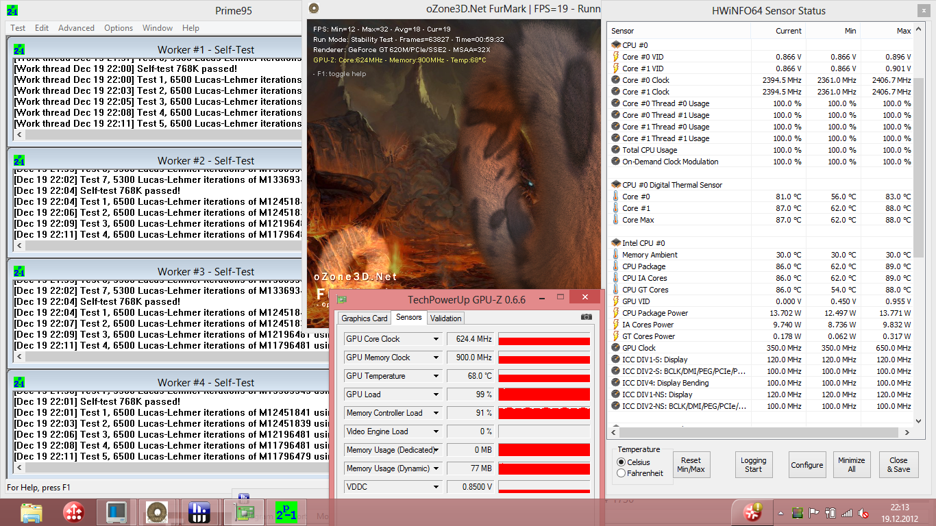 In unserem Stresstest simulieren wir das Horror-Szenario für jedes Notebook: Prime95 und FurMark verlangen dem Testkandidaten für mindestens eine Stunde alles ab – auch wenn dies so in der Realität kaum vorkommt, sollten weder Prozessor noch Grafikkarte überhitzen oder throtteln. Beides ist beim T430u nicht der Fall: 87 °C für den Core i5 sowie 68 °C für die GT 620M sind als vollkommen unkritisch anzusehen, zumal beide ihren jeweiligen Maximaltakt halten.