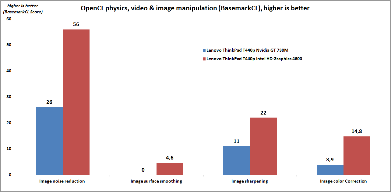 Bei den üblichen Office-Aufgaben ist die sparsame Intel-Grafik klar vorzuziehen. Aber auch bei Sonderaufgaben wie der Videokonvertierung per Quick Sync Video arbeitet die Intel-Lösung schneller und energiesparender, als etwa Nvidias CUDA-Technologie. Wenn es um die offene Grafikschnittstelle OpenCL geht, kann Nvidias GT 730M ebenso wenig überzeugen (siehe Grafik). OpenCL kommt immer öfter bei Bild- und Videobearbeitungsprogrammen zum Einsatz, wenn Filter und Bildverbesserungen per Grafikchip durchgeführt werden sollen.