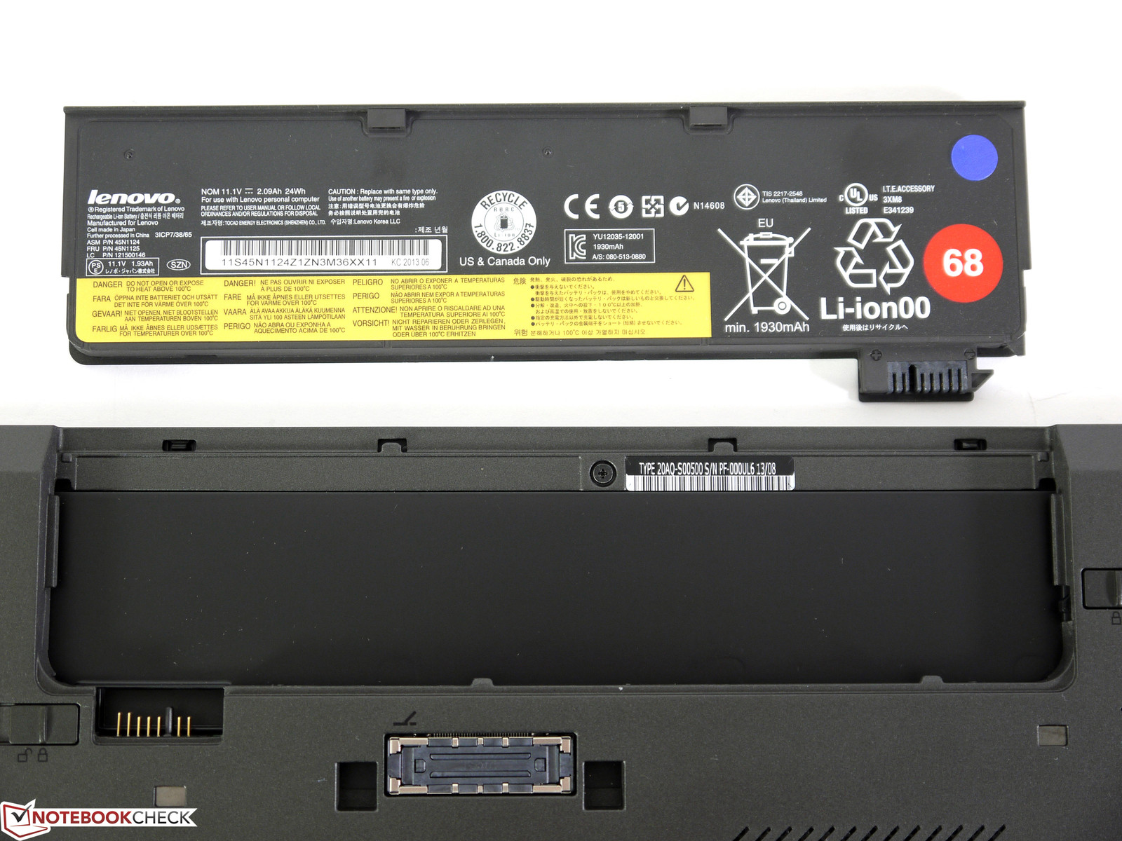 Eine der elementaren Neuerungen, mit denen das ThinkPad T440s aufwartet, ist das Power Bridge genannte Akkukonzept. Lenovo kombiniert hier einen fest eingebauten Akku mit einer Kapazität von 24 Wh mit einem austauschbaren Akku den man, wie von den Vorgängern her bekannt, ganz normal am Unterboden entnehmen kann. Unser Testmodell ist mit einem weiteren 24-Wh-Akku ausgestattet und bietet damit eine Gesamtkapazität von 48 Wh. Alternativ hat Lenovo einen 6 Zellen Akku 68+ mit 72 Wh Kapazität (0C52862) angekündigt. Dieser sollte die möglichen Laufzeiten zwar verdoppeln, ist allerdings auch deutlich ausladender und wiegt etwa 150 g mehr. Der Vorteil dieses 2-Akku-Konzepts zeigt sich vor allem dann, wenn man oft einen Akkutausch vornehmen muss und nicht gleichzeitig das System herunterfahren kann oder will. Zudem hat man eine etwas größere Ausfallsicherheit, wenn einer der Akkus nicht mehr so recht will.
