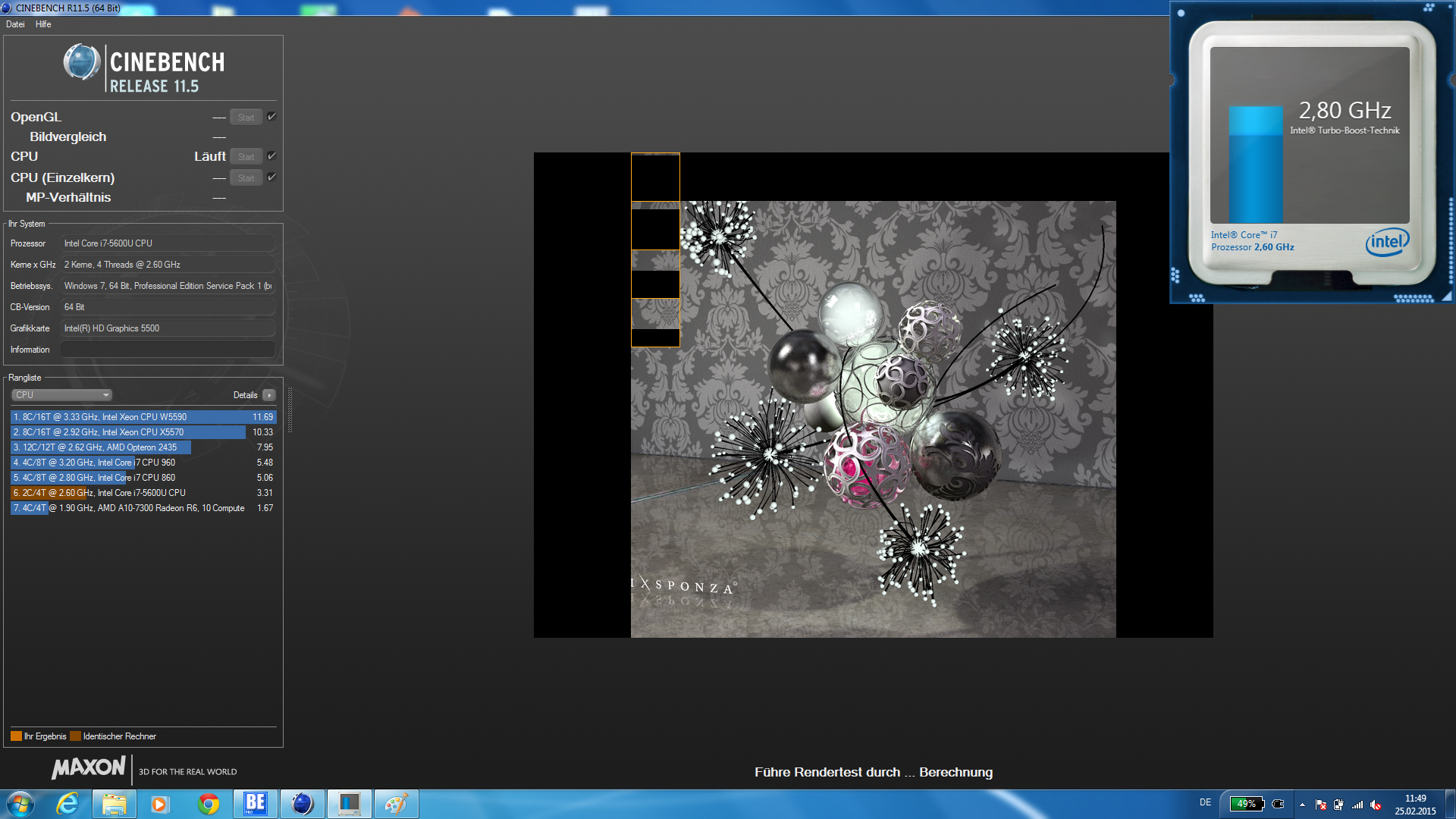 Die von Intel definierten Turbo-Taktraten des Core i7-5600U stellen lediglich eine Obergrenze dar – ob und wie lange diese in realen Anwendungen wirklich anliegen, wird durch weitere Parameter wie Leistungsaufnahme und Kerntemperatur determiniert. Broadwell-Chips profitieren hierbei von ihrer fortschrittlichen 14-Nanometer-Fertigung, die bei gleichem Verbrauch höhere Frequenzen als der vorherige 22-Nanometer-Prozess gestattet.