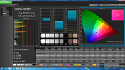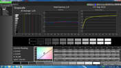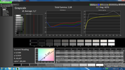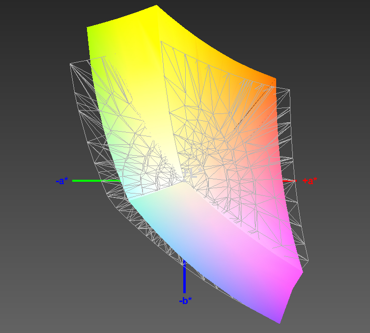 Bereits mit Werksprofil gibt es an der Farb- (Delta E 4,35) und Graustufenwiedergabe (Delta E 3,7) nicht viel zu meckern. Unsere routinemäßig durchgeführte Kalibrierung verbessert vor allem die RGB-Balance und nähert die Farbtemperatur den gewünschten 6.500 K an, aber auch die Delta-E-Abweichungen gehen noch etwas weiter zurück. Problematisch bleibt die Darstellung einiger Gelb- und Orange-Töne. Für Grafikdesign und Fotobearbeitung auf professionellem Niveau führt angesichts des begrenzten Farbumfangs (54,7 % AdobeRGB, 84 % sRGB) (Korrektur 20.5.2015 zufolge fehlerhaften Referenz-sRGB-Profils) ohnehin kein Weg an einem externen Monitor vorbei.