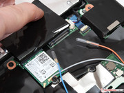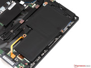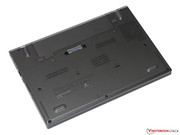 Auch ohne vorheriges Studium des bereitgestellten Hardware Maintenance Manuals lassen sich viele Wartungsaufgaben schnell und einfach durchführen. Zunächst müssen an der Unterseite insgesamt 10 Kreuzschlitzschrauben entfernt werden, um anschließend die eingeklippte Bodenplatte vorsichtig abheben zu können. Arbeitsspeicher (ein Slot, belegt), Datenträger (2,5", 7 Millimeter Bauhöhe), WLAN-Modul und der interne Akku sind nun ebenso zugänglich wie der einzige Lüfter des Gerätes. Zum Nachrüsten eines WWAN-Adapters steht ein freier M.2-Steckplatz samt vorverlegter Antennenkabel bereit; alternativ findet hier eine zweite SSD Platz.