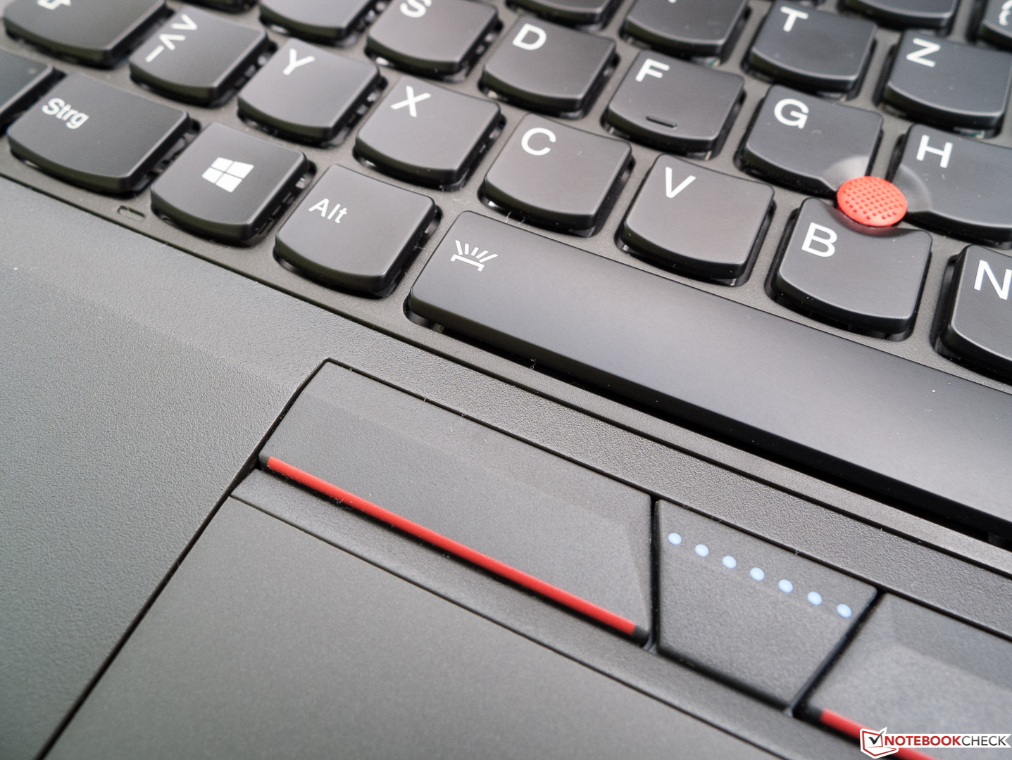 Das auf den ersten Blick etwas merkwürdig anmutende Touchpad schuldet seine drei oben angebrachten Tasten dem schon seit IBM-Zeiten offenbar unverzichtbaren TrackPoint. Wer ihn noch verwendet, kann so gleichzeitig die Tasten erreichen, die sich durch relativ viel Hub, einen angenehmen Widerstand und einen deutlichen Druckpunkt auszeichnen, dafür aber jedes akustische Feedback vermissen lassen. Bei unserem Testsample klappert die rechte Taste leider, auf eine Abwertung haben wir (da es sich hierbei um einen von der Garantie abgedeckten Defekt handelt) jedoch verzichtet.