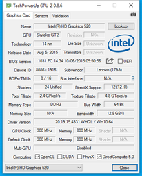 Sicher nicht zu den interessantesten Aspekten für die Zielgruppe des Lenovo T460 gehört die in die CPU integrierte, sehr sparsame, aber auch schwachbrüstige Grafikeinheit Intel HD 520 ohne dedizierten Grafikspeicher, die sich die knappe TDP von 15 Watt mit der CPU teilen muss. Die erreichbare Performance hängt zum einen von der CPU ab. Zum anderen profitiert die GPU klar von Dual-Channel-RAM, muss im Testgerät aber mit einem Speicherkanal auskommen.