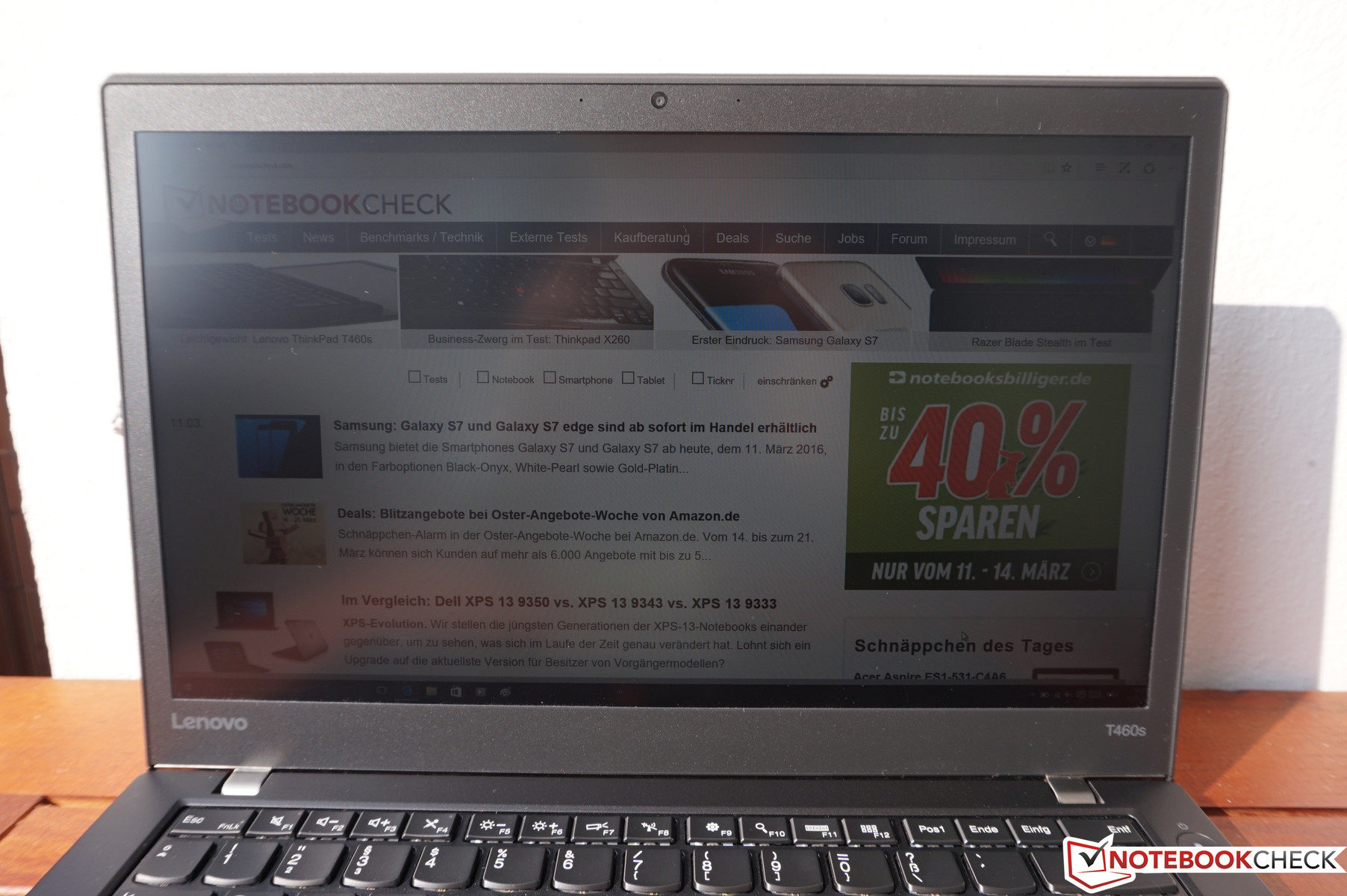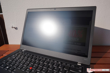 Im Freien profitiert das ThinkPad T460s natürlich von der matten Bildschirmoberfläche, hier ist eher die Helligkeit der begrenzende Faktor. Solange man direkte Sonneneinstrahlung vermeiden kann, lässt sich das Gerät auch noch in hellen Umgebungen benutzen, da die Bildschirmhelligkeit im Akkubetrieb nicht reduziert wird. Wirklich komfortabel kann man dann aber nicht mehr arbeiten, da es schon nach kurzer Zeit recht anstrengend für die Augen wird. Im Schatten gibt es hingegen keine Probleme.