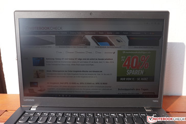 Lenovo stattet das ThinkPad T460s ausschließlich mit IPS-Displays aus. Die Full-HD-Auflösung (1.920 x 1.080 Pixel) führt in Verbindung mit dem 14 Zoll großen Bildschirm zu einer ordentlichen Pixeldichte von 157 ppi. Der Vorteil dieser Auflösung ist, dass man sie auch noch problemlos ohne Skalierung verwenden kann. Wie schon bei früheren Modellen kommen Displays von unterschiedlichen Zulieferern zum Einsatz, eine gewisse Panel-Lotterie kann man also nicht vermeiden. Das Panel in unserem Testgerät trägt die Bezeichnung N140HCE-EAA (LEN40A9) und stammt damit von Innolux. Alternativ kommt ein FHD-Panel von LG zum Einsatz.