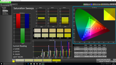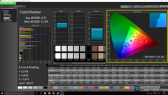 Im Werkszustand können wir durchschnittliche DeltaE-2000-Abweichungen von 6,44 (Farben) bzw. 5,87 (Graustufen) gegenüber dem sRGB-Referenzfarbraum messen, womit sich die Full-HD-Version ungefähr auf dem mittelmäßigen Niveau des teureren WQHD-Modells bewegt. Während sich das hochauflösende Panel nach einer Kalibrierung jedoch deutlich besser präsentiert, ist der Erfolg bei dem vorliegenden FHD-Modell eingeschränkt. Am meisten profitiert die Graustufendarstellung, deren DeltaE-2000-Wert auf sehr gute 1,03 abfällt. Auch bei den Farben verbessert sich die durchschnittliche Abweichung auf 4,71, es gibt aber immer noch extreme Ausreißer, vor allem für blaue Töne (bis zu 16). Auch bei der Farbraumabdeckung muss sich das FHD-Panel dem WQHD-Display deutlich geschlagen geben. Wir ermitteln lediglich 61 % für den sRGB und knapp 40 % für den anspruchsvolleren AdobeRGB-Standard. Damit disqualifiziert sich das FHD-Display für professionelle Bildbearbeitung.
