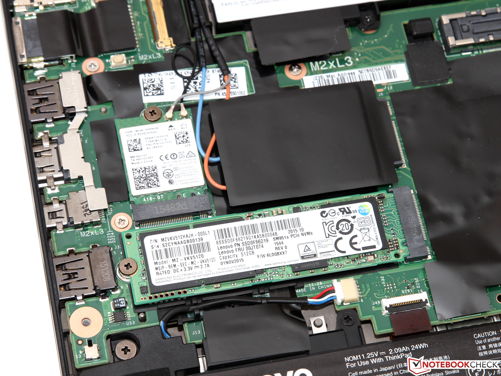 Ebenso wie dem kürzlich getesteten ThinkPad T560 fehlt auch dem T460s ein dedizierter Wartungszugang. Da die Bodenplatte jedoch nur von fünf Schrauben gehalten wird und sich nach dem Lösen derselben einfach abnehmen lässt, sollten auch weniger versierte Anwender das Gerät ohne Beschädigungsgefahr öffnen können. Im Inneren erwarten uns gleich mehrere Überraschungen: Zum einen hat Lenovo jeglichen 2,5-Zoll-Schacht gestrichen und setzt ausschließlich auf SSDs im M.2-2280-Format. Leider schweigt sich der Hersteller darüber aus, ob auch jedes Modell schnelle PCIe-3.0-SSDs unterstützt – bei einigen Konfigurationen könnte der M.2-Slot womöglich nur per SATA angebunden sein. Zum anderen erstaunt uns, dass nunmehr beide Akkus im Gehäuse verschraubt sind; beim T450s wurde einer der beiden Speicher extern angesteckt und konnte im Betrieb getauscht werden.