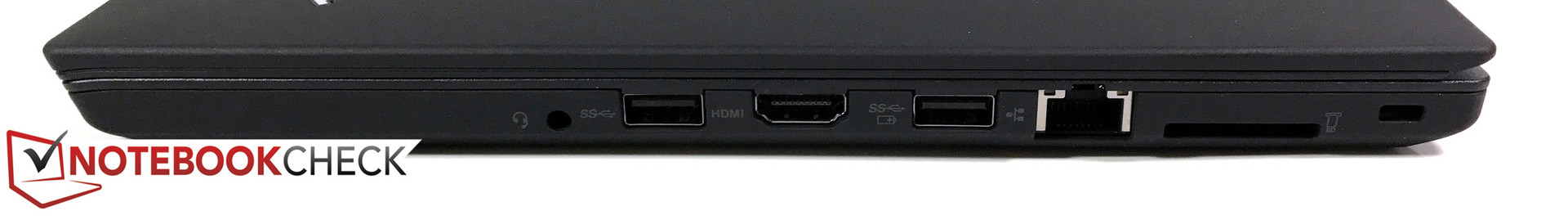 Lenovo nutzt den vorhandenen Platz an den beiden Gehäuseseiten sehr gut aus und implementiert zusätzlich noch drei normale USB-3.0-Anschlüsse (USB 3.1 Gen. 1, 1x Always-On), einen RJ45-Stecker, einen vollwertigen SD-Kartenleser und einen SmartCard-Leser. Für dedizierte Dockingstationen (bisherige Modell sind kompatibel) steht zudem der Dockinganschluss auf der Unterseite zur Verfügung. Das Layout gefällt uns sehr gut – alle Anschlüsse befinden sich im hinteren Bereich der Seiten und zwischen den einzelnen Steckern gibt es ausreichend Platz. Die Leistung der normalen USB-Anschlüsse fällt gut aus; in Verbindung mit unserer externen Samsung SSD T3 werden Daten mit mehr als 380 MB/s übertragen.