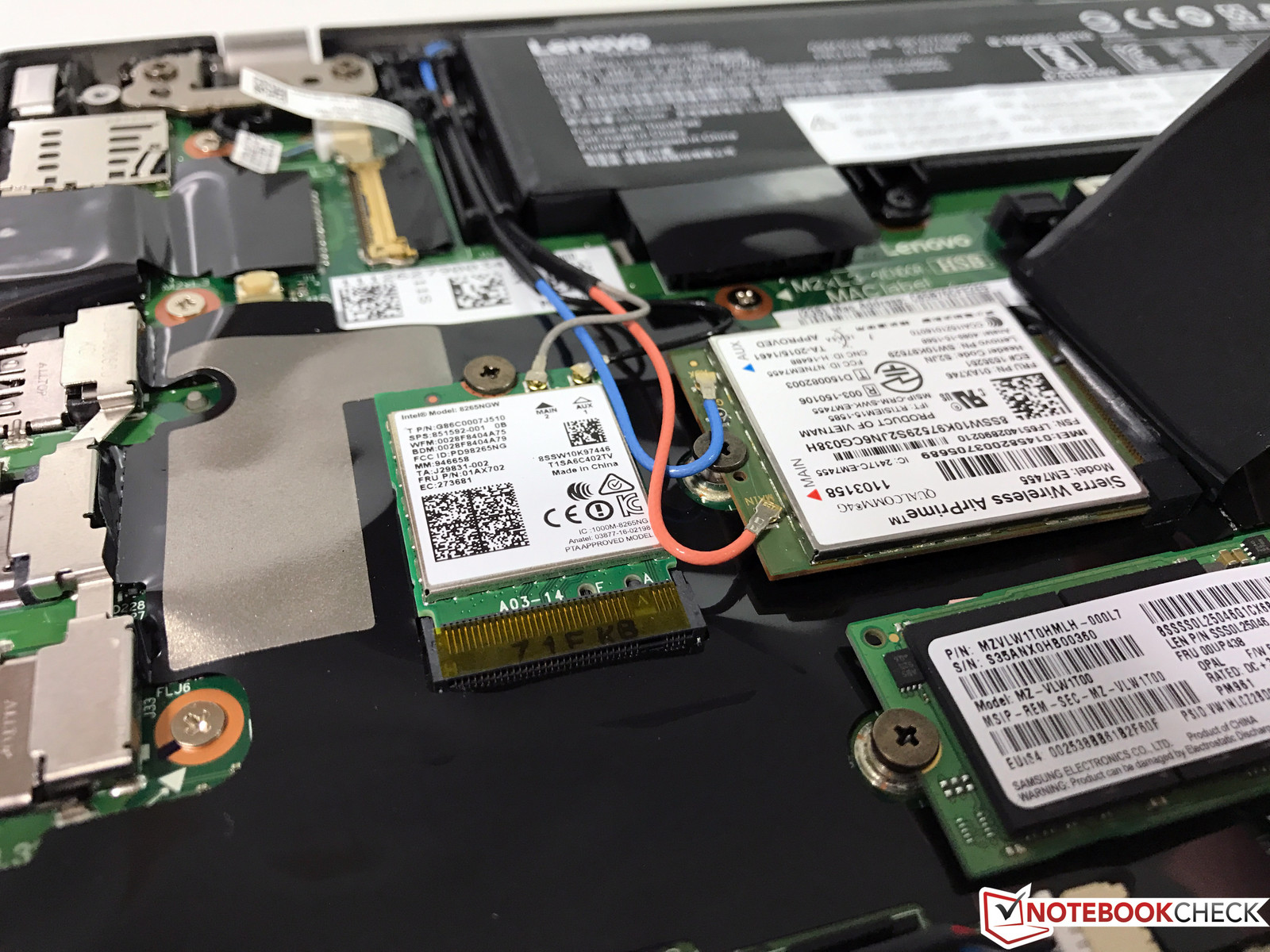 Unser ThinkPad T470s ist neben der beliebten Dual-Band Wireless-AC 8265 WLAN-Karte von Intel auch mit einem WWAN-Modul ausgestattet (Sierra Wireless EM7455, M.2). Optional bietet Lenovo auch noch die WiGig-Karte Intel 18625 an, die für den Betrieb mit der WiGig-Dockingstation erforderlich ist. Im Gegensatz zum ThinkPad T470 schließen sich die beiden Technologien in diesem Fall jedoch aus.
