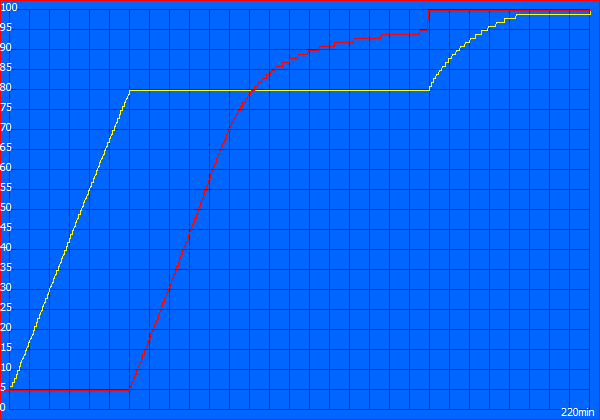 Zunächst haben wir uns die maximale bzw. die minimale Laufzeit angesehen. Im Leerlauf (minimale Helligkeit) mit deaktivierten Funkmodulen läuft das Gerät fast 20 Stunden lang. Unter maximaler Last ist das Ergebnis mit 3:21 Stunden sehr gut, allerdings muss man hier natürlich die deutlich reduzierte Leistung im Akkubetrieb berücksichtigen. Die Schleife unseres Full-HD-Testvideos (Big Buck Bunny, H.264) ermittelt bei einer angepassten Helligkeit von rund 150 cd/m² eine gute Laufzeit von beinahe 10 Stunden.