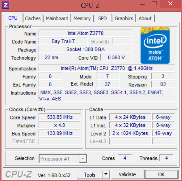 Verglichen mit anderen üblichen CPUs aktueller Tablets - wie dem Toshiba Encore 8 und dem Lenovo Miix 2 - ist der größte Unterschied des Z3770, dass er potentiell eine viel höhere Taktrate von maximal 2,4 GHz versus maximal 1,86 GHz erreicht (außer verglichen mit dem Z3740D im Dell Venue 8 Pro mit nur Single-Channel-Memory-Controller und einer niedrigeren maximalen Bildschirmauflösung). Man beachte jedoch, dass dies nur gilt, wenn es thermischen Spielraum für höhere Taktraten gibt. Vielleicht erklärt dies, warum wir durchschnittliche Benchmarkergebnisse für das Z3770 beobachteten, die viel näher bei jenen des Z3740 liegen als der Unterschied theoretisch vermuten ließe (mehr als 5–6 % höher in den meisten Fällen (wie in wPrime und superPi) und nie viel mehr als 10 % (wie im 3DMark Cloud-Gate-Standard-Physics).