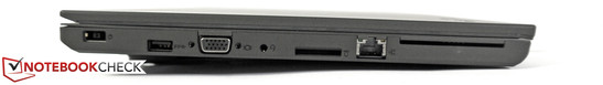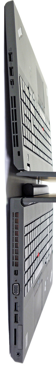 Trotz der kompakt-schlanken Bauweise, finden wir alle wichtigen Schnittstellen am Gehäuse. 3 x USB 3.0, Mini-DisplayPort, VGA und ein Kartenleser decken die gefragtesten Bereiche ab. Zudem bietet das ThinkPad W550s einen echten Dockingport am Unterboden, der im stationären Betrieb zusammen mit einer Dockingstation ein üppiges Peripherie-Arsenal aufnehmen kann. Die sonstige Schnittstellenanordnung steht natürlich unter dem Diktat der flachen Seitenteile. Zwischen den Anschlüssen könnten hier und da die Abstände etwas größer ausfallen, um mit angesteckten Kabeln, Adaptern oder Erweiterungen nicht die jeweiligen Nachbarports zu blockieren. Warum ausgerechnet der LAN-Anschluss so weit vorne platziert ist, erschließt sich uns nicht wirklich.
