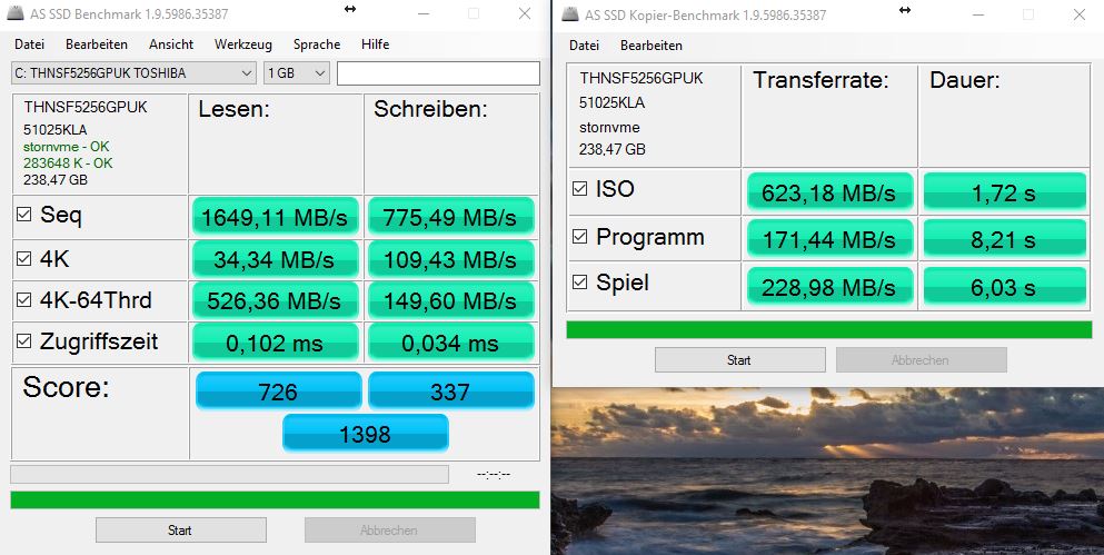 Beim Massenspeicher vertraut Lenovo, in unserem Fall, auf eine 256 GB fassende SSD von Toshiba. Die SSD im M.2-Format ist über die schelle PCIe-Schnittstelle angebunden. Die Performance der Toshiba SSD ist gut. Beim sequenziellen Lesen erreicht die SSD laut AS SSD 1.649 MB/s und beim sequenziellen Schreiben immerhin noch gute 775 MB/s. Gut gefällt uns auch die 4K-Read-Performance, welche bei 34 MB/s liegt. Als Sicherheitsfeature unterstützt die SSD auch die Selbstverschlüsselung nach dem OPAL 2.0 Standard. Ein Tausch der SSD ist problemlos, denn die Unterseite der Base lässt sich sehr leicht entfernen. Momentan gibt es M.2 SSDs mit Speicherkapazitäten von 2 TB. Der freie M.2-2242-Steckplatz (Platzhalter für ein WWAN-Modul) kann laut Herstellerinformationen nicht mit einer SSD kombiniert werden.