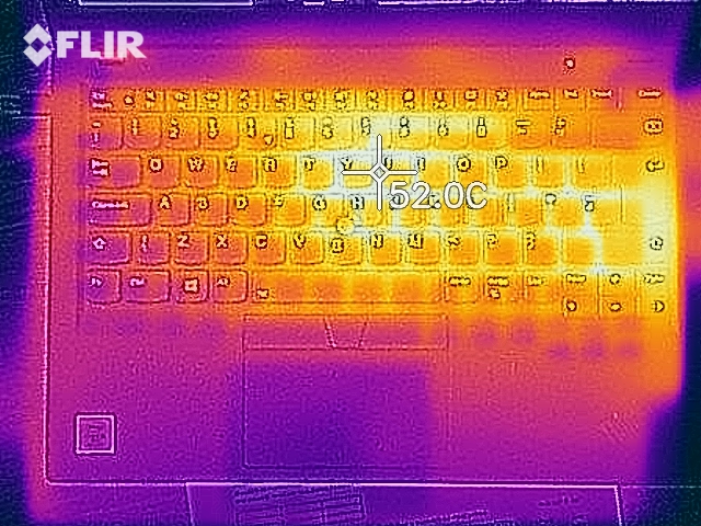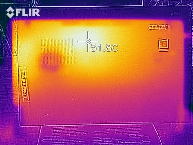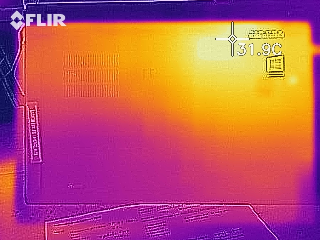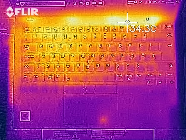 Während die Oberflächentemperaturen im Idle-Betrieb maximal 28 °C und im wichtigen Bereich der Handballenablage sogar nur gut 24 °C erreichen, werden es unter hoher Dauerlast, die im Hinblick auf den anvisierten Einsatzzweck als Business-Notebook nur selten anliegen sollte, maximal 41,6 °C. Diese, an der Unterseite in der Mitte unter dem Bildschirm gemessene Temperatur könnte empfindlichere Nutzer bei Verwendung auf dem Schoß auf Dauer durchaus stören.