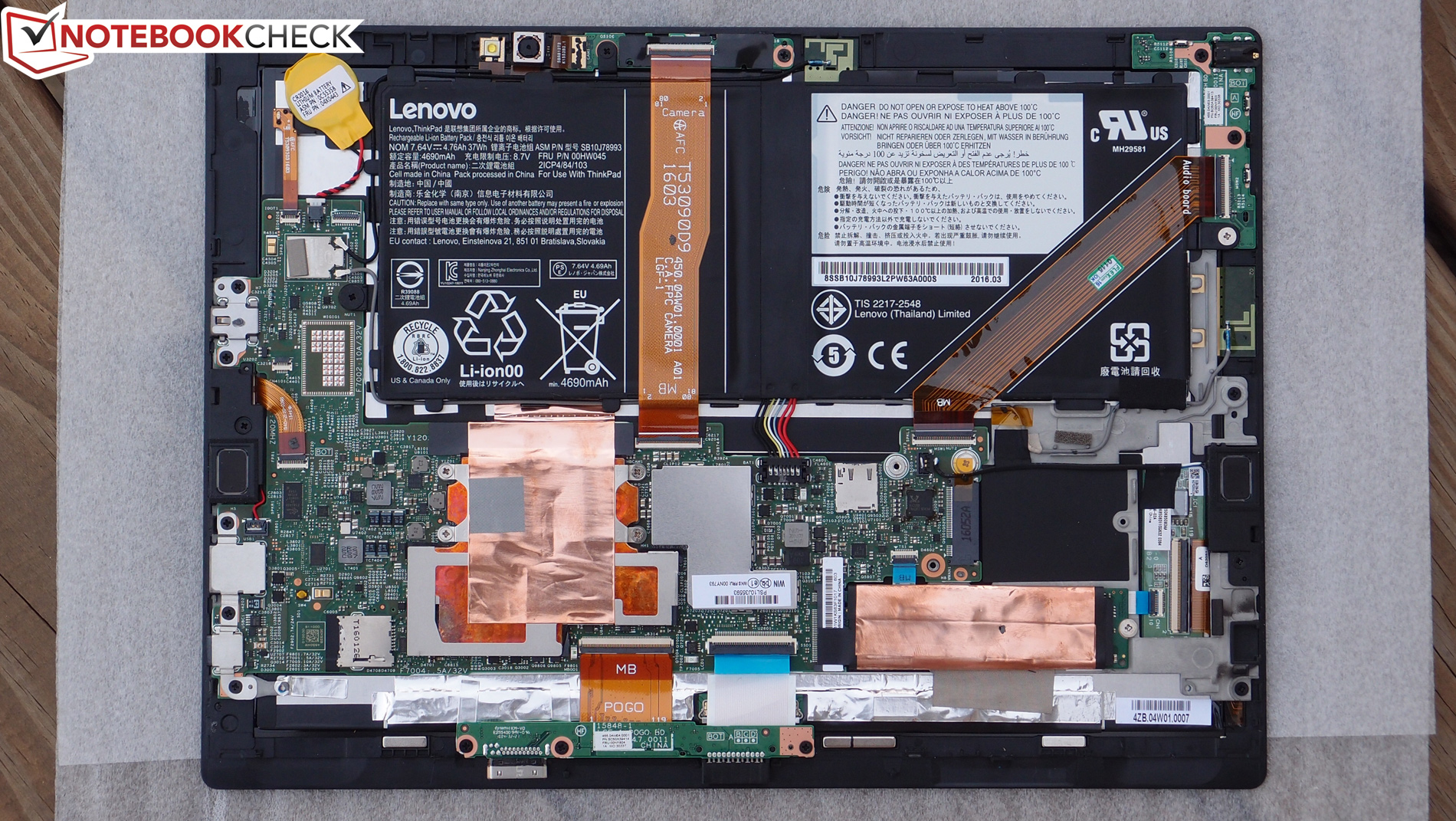Doch wie ist es um die Stabilität bestellt? Während das Gerät vorwiegend solide ist, scheint es nicht so undurchdringlich wie das Microsoft Surface Pro 4. Das Tablet lässt sich mit mäßiger Druckanwendung in der Hand etwas verwinden, besonders dann, wenn es verdreht wird. Da das Keyboard-Cover noch deutlich dünner ist, lässt es sich natürlich noch leichter verzerren. Das liegt möglicherweise teilweise an seiner, wie Lenovo es nennt "Enterprise-Level”-Reparaturmöglichkeit, die durch eine mit insgesamt fünf Schrauben und einer Reihe von Klammern entlang des Geräteumfangs (zwischen Bildschirm und rückseitiger Abdeckung) befestigte Wartungsklappe realisiert wurde. Das Gerät kann in zirka 5 bis 10 Minuten geöffnet werden, doch der User muss bei den Klammern entlang des Umfangs Sorgfalt walten lassen, um dabei den Bildschirm nicht zu beschädigen. Das Design ermöglicht Zugriff auf eine Reihe von durch den Benutzer tauschbaren Komponenten, zu welchen der Akku, die SSD, der WLAN-Adapter, der WWAN-Adapter und die CMOS-Batterie sowie einige speziellere Teile wie die Lautsprecher und die Aufsteckplatinen für verschiedene Schnittstellen und der Docking-Verbindung an der Unterseite gehören.