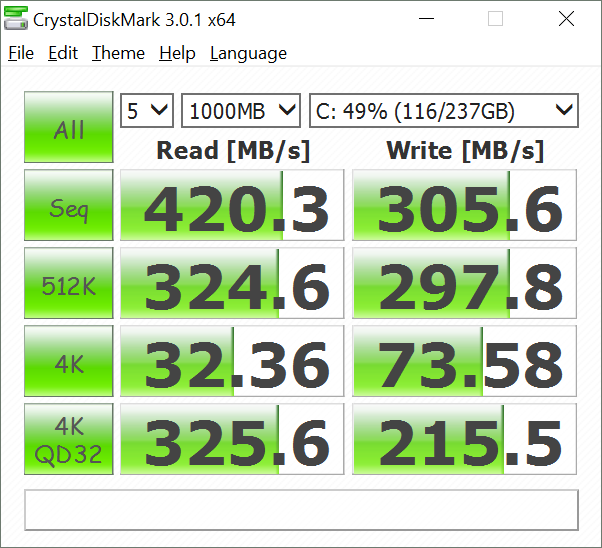 Natürlich kann ein großer Teil der flotten Systemleistung der Samsung PM871 SSD zugeschrieben werden, welche, obwohl es sich nicht um ein NVMe-Modelle handelt, trotzdem respektable Werte und eine gute 4K-Leseleistung liefert. Der AS SSD Gesamtscore von 997 kann sich sehen lassen.