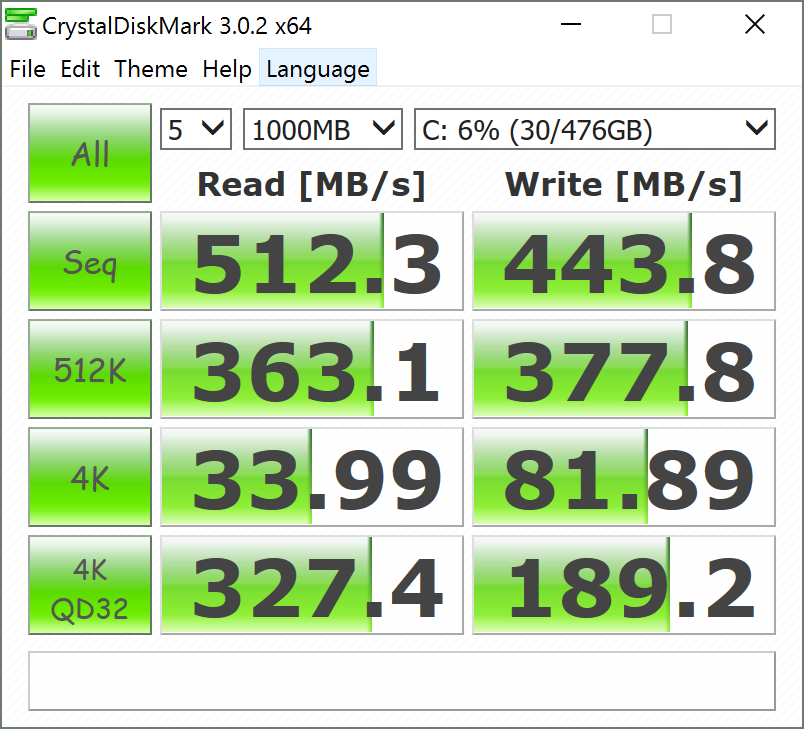Unser Testmodell nutzt eine 512-GB-M.2-SSD - nämlich eine Samsung PM871. Was die Leistung betrifft, so schneidet das Laufwerk ziemlich gut ab. Wegen der SATA-Schnittstelle sind die maximalen Übertragungsraten nicht so hoch, wie man es sich erhoffen könnte, und bleiben generell unter 500 MB/s. NVMe-basierte Laufwerke - siehe die Samsung SM951 M.2 SSD im Vaio Z Flip VJZ13BA11L - sind mit fast dreifacher Lese- und mehr als doppelter Schreibgeschwindigkeit deutlich schneller. Natürlich könnte man argumentieren, dass hochwertige Laufwerke wie diese für normale Office-Aufgaben keine wesentlichen Vorteile bringen und viele Nutzer größere Laufwerke mit höheren Übertragungsraten vorziehen. Wie zuvor erwähnt, können User sich den Laufwerkstyp aussuchen, wenn sie ihr Notebook auf Lenovos Webseite konfigurieren.