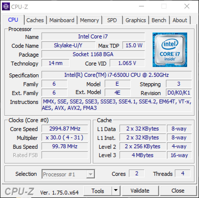 Der Intel Core i7-6500U ist eine ULV-Dual-Core-CPU mit Skylake Architektur und einer TDP von 15 Watt. Die CPU hat eine nominelle Taktfrequenz von 2,5 GHz. Der integrierte Turbo ermöglicht ein Übertakten auf 3,1 GHz bei Single-Core-Last bzw. 3,0 GHz bei Multi-Core-Last. Mit Ergebnissen von 128 und 307 (single/multi) im Cinebench-R15-Test schneidet die i7-6500U genauso gut ab wie die gleiche CPU in anderen Notebooks. Verglichen mit der i5-6200U, die im HP Spectre x360 13 zum Einsatz kommt und auch eine Option für das X1 Yoga ist - ist diese nur zirka 10 % langsamer. Die sehr hochwertige Core i7-6567U im Vaio Z Flip VJZ13BA11L gehört zu den schnellsten ULV-Prozessoren und übertrifft die i7-6500U um 15-20 % in Single- und Multi-Thread-Leistung.