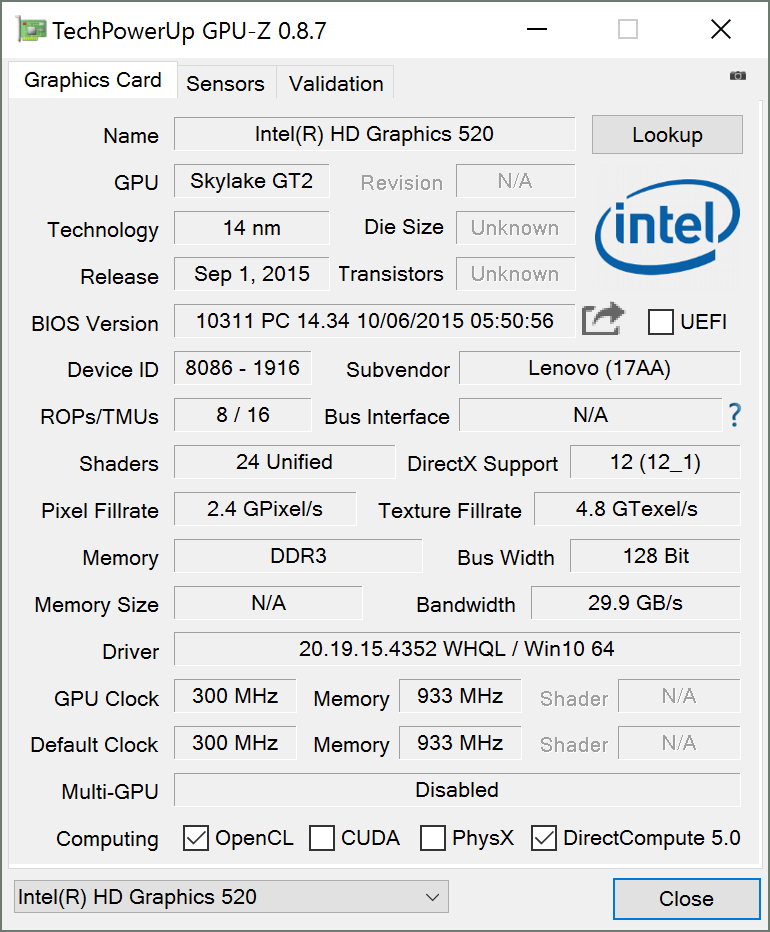 Die integrierte HD Graphics 520 GPU mit 24 EUs ist definitiv kein Kraftwerk, doch sie unterstützt DirectX 12 und den neueren H.265-Standard. Die GPU hat Zugriff auf die 8-GB-Dual-Channel-LPDDR3-RAM des Systems. Andere Grafikkarten werden nicht angeboten - was in Anbetracht der Zielgruppe und des schlanken Designs nicht überrascht. Nichtsdestotrotz würde eine Intel-Iris-GPU die Leistung auch deutlich verbessern. Das Microsoft Surface Book zeigt mit HD Graphics 520 eine ähnliche Leistung. Sobald die eigenständige Maxwell GPU im Tastatur-Dock übernimmt, verdoppelt sich die Leistung fast. Das HP Spectre x360 13 (Intel Core i5-6200U, HD Graphics 520) ist nur einige Prozentpunkte langsamer im 3DMark 11 Performance Test. Laut unseren Tests mit verschiedenen Tools erreicht die GPU maximal 1.050 MHz (das theoretische Maximum) für den Kern bzw. 933 MHz für den Speicher.
