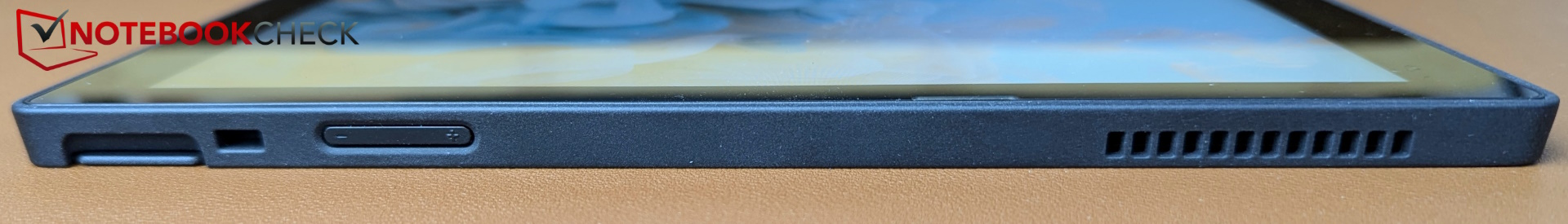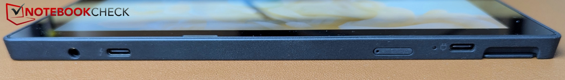 Denn selbst für ein (Windows) Tablet gibt es davon ausgesprochen wenig: Zwei USB-C-Ports und ein Headset-Klinkenausgang, das war es auch schon. Thunderbolt 4 unterstützt nur der obere der beiden USB-Anschlüsse, der untere überträgt Daten mit maximal 10 Gbit/s. Sobald der untere Port am Ladekabel hängt, steht uns also noch genau 1 USB-C-Port zur Verfügung. Ein externes Dock ist da fast schon Pflicht, zumindest bei der Nutzung als Laptop. Neben einem Kensington-Anschluss findet man sonst nur noch den SIM-Slot, welcher Platz für eine Nano-SIM bereit hält.