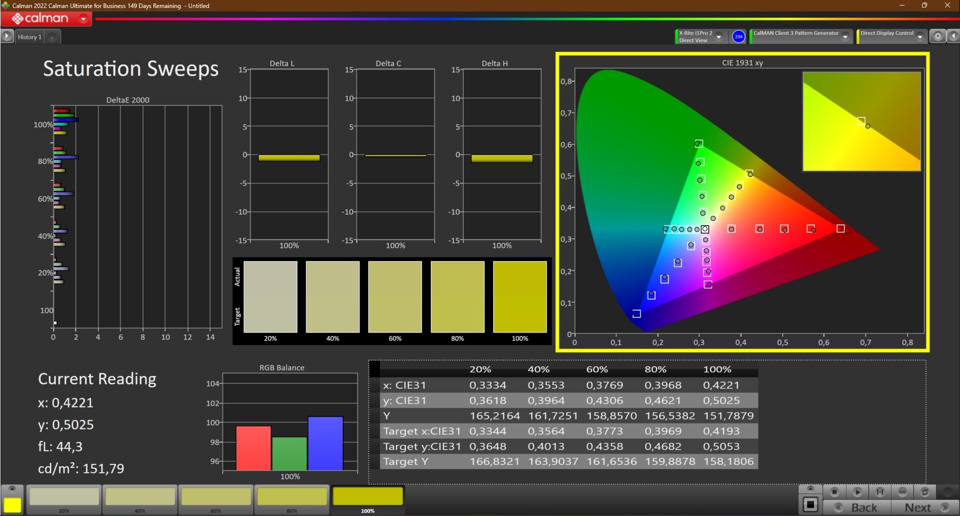 | Delta E Graustufen * | 0.9 | 2 -122% | 2.4 -167% | 2.3 -156% | 2.6 -189% |