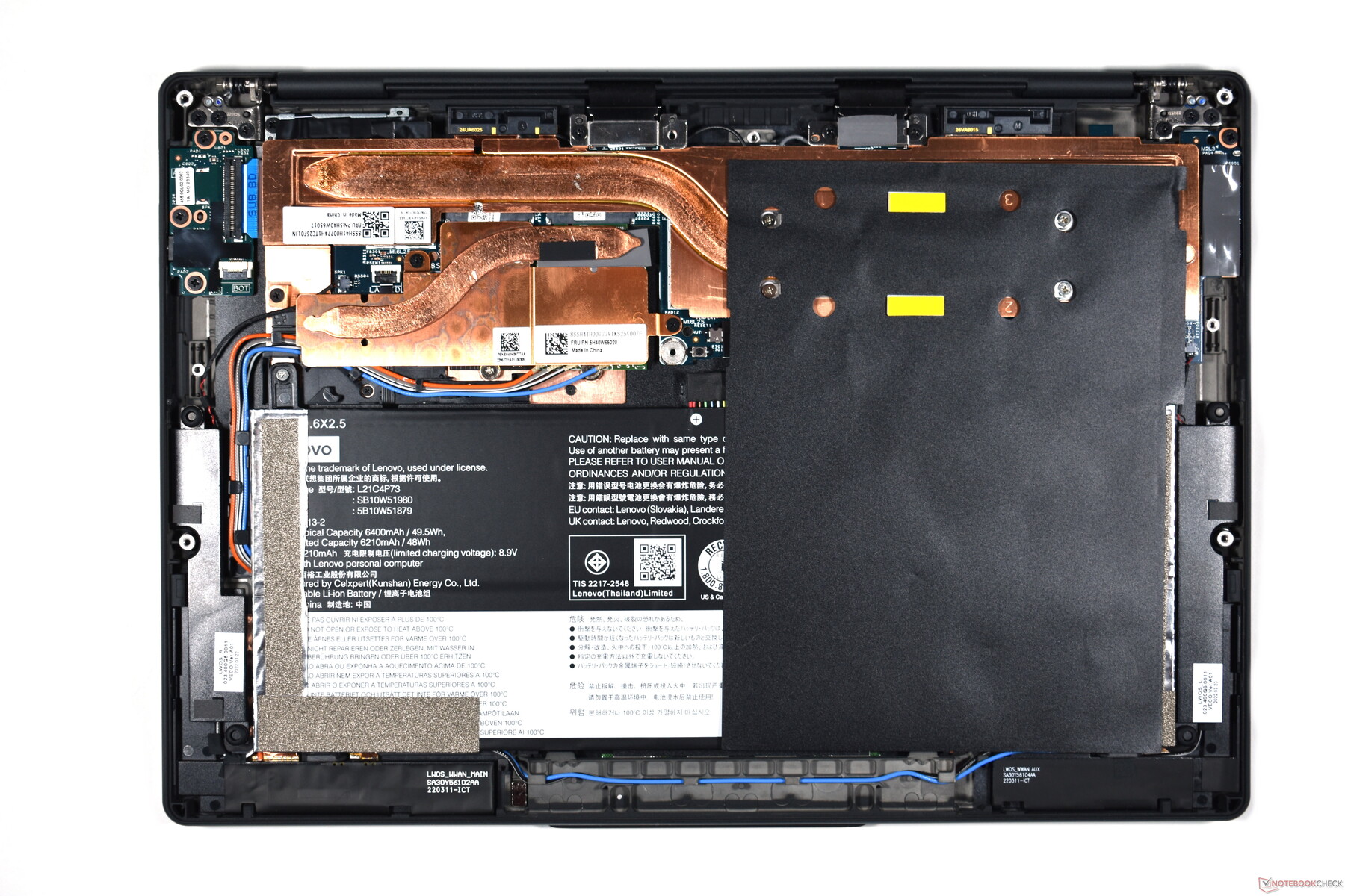 Da der Arbeitsspeicher verlötet ist, gibt es beim ThinkPad-Laptop nicht viel aufzurüsten. Die M.2-2242-SSD kann getauscht werden, allerdings nur gegen ein Modell ohne Chips auf der Unterseite des Moduls. Ab Werk sind die SSD sowie das 5G-Modul unter einem Kupfer-Heatsink verborgen, den man nach dem Lösen von zwei Schrauben aber einfach entfernen kann.