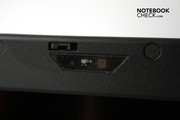 Auf der linken Seite befinden sich von vorne nach hinten zunächst ein Card-Bus-Steckplatz, darunter der Hardwareschalter für die drahtlose Kommunikation und ein USB 2.0-Steckplatz. Es folgt der LAN-Port mit bis zu einem Gigabit Übertragungskapazität, sowie der VGA-Steckplatz, der Lüfter, der Stromeingang und ganz hinten ein Anschluss für ein Kensington Lock.