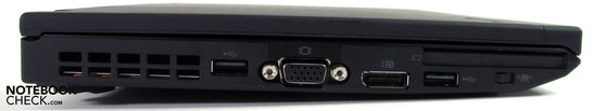 Die Art, die Verteilung und auch die Qualität der Anschlüsse haben sowohl Licht- als auch Schattenseiten. Typische Businessschnittstellen dürfen auch bei einem kleinen 12,5“ Notebook nicht fehlen. Hier lässt Lenovo nichts anbrennen. So kann man auf zwei Monitoranschlüsse (Displayport und VGA), einen Dockingport, Kensington-Vorbereitung und Fingerabdruckscanner zurückgreifen. Ansonsten stehen noch drei USB 2.0 Schnittstellen, ein kombinierter Kopfhörer-/Mikrofonanschluss, Gigabit-LAN, ExpressCard/54-Schacht und ein Kartenleser zur Verfügung. Im Inneren hat man die Möglichkeit einen mSata Steckplatz mit voller Baugröße zu nutzen. Hier passen entweder eine UMTS-Karte (Antennen und SIM-Slot sind bereits vorhanden) oder ein mSata SSD-Modul.