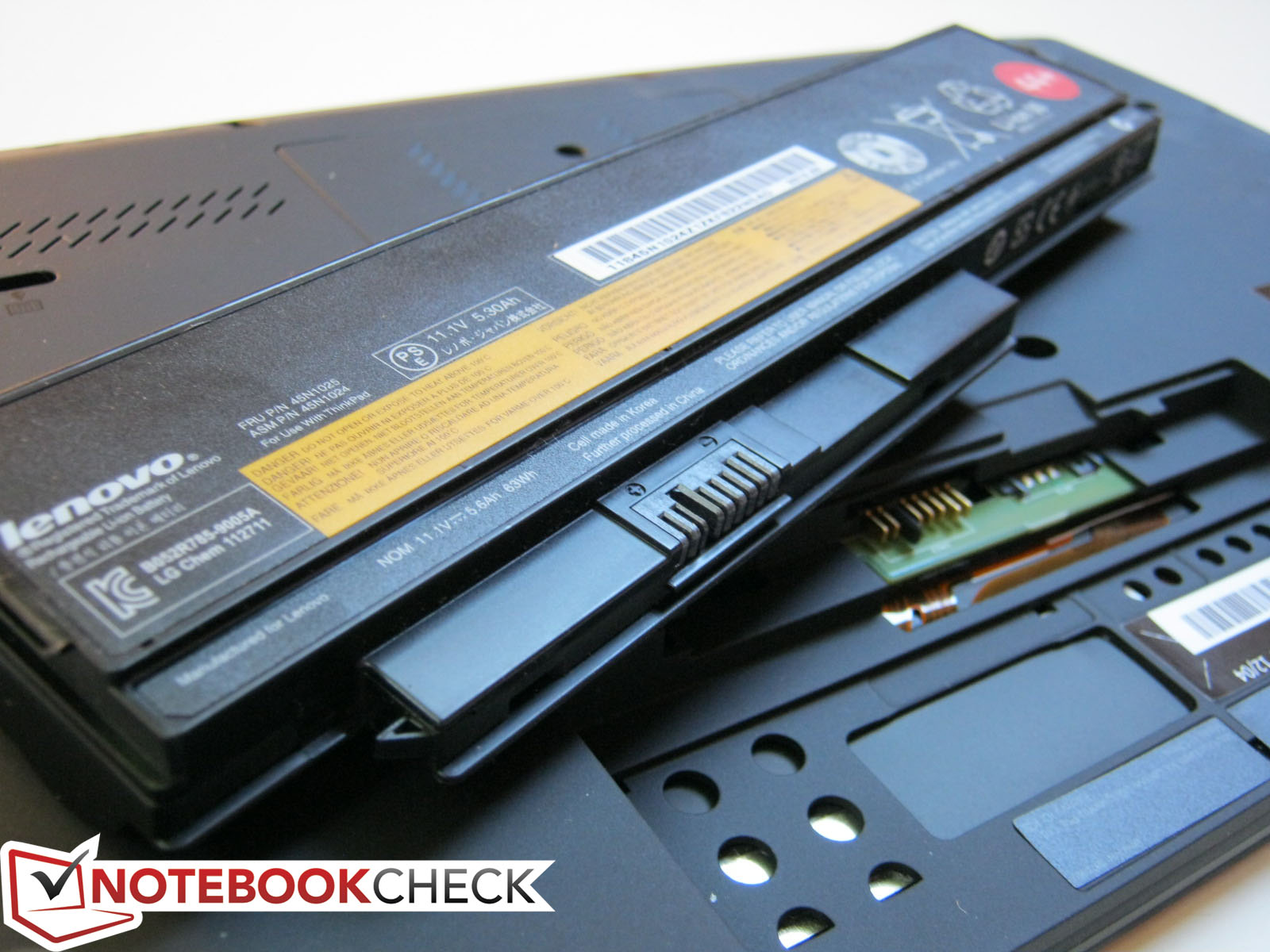 Unser Testmodell ist mit einem 6-Zellen 63Wh Li-Ion Akku ausgestattet, der eine Akkulaufzeit von bis zu 9.9 Stunden verspricht. Wie üblich bietet Lenovo auch kleinere und größere Akkuoptionen, von 4-Zellen (29Wh) bis zu 9-Zellen (94Wh) für bis zu 14.8 Stunden Akkulaufzeit. Ein 6-Zellen Sekundärakkuslice (57Wh) steht auch zur Verfügung und soll bis zu 24.9 Stunden Akkulaufzeit ermöglichen, wenn er gleichzeitig mit dem 9-Zellen Primärakku verwendet wird.