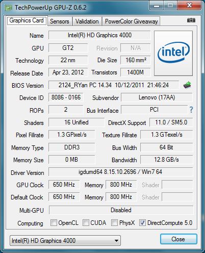 Als Ivy Bridge CPU, bietet die Core i5-3320M Zweikern-CPU die integrierte Intel HD 4000 GPU. Der Nachfolger der Sandy Bridge Intel HD 3000 wurde auf Notebookcheck ausführlich getestet. Im X230 taktet die Intel-GPU im Idle-Betrieb standardmäßig mit 350MHz. Per Turbo Boost wird die GPU bei Bedarf auf bis zu 1200MHz hochgetaktet, wobei der Speicherbus konstant einen 800MHz Takt nutzt. Für weitere Informationen zur HD 4000 verweisen wir auf die eigene Benchmarkseite.
