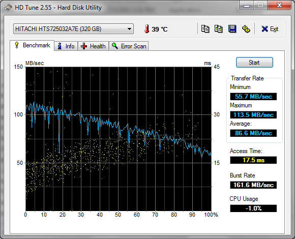 Die durchschnittliche Transferrate des Hitachi Laufwerks beträgt laut HDTune 87MB/s und ist viel besser als typische 5400 U/min Laufwerke, die oft 80 MB/s oder weniger schaffen. Die Hitachi ist zwar gut, aber nicht das schnellste 7200 U/min Laufwerk, da einige hochwertige Notebooks mit Festplatten ausgestattet sind, die 90 MB/s und mehr erreichen. Beispielsweise die 750GB Hitachi im HP Envy 15 weist eine durchschnittliche Transferrate von 92.7 MB/s bei kurzer Zugriffszeit auf. Hier finden sie unsere stetig wachsende HDD/SSD Benchmark-Datenbank.