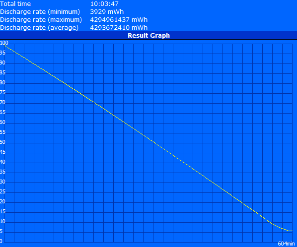 Mit dem BatteryEater Readers Test überprüfen wir die von Lenovo behaupteten 9.9 Stunden Laufzeit. Dazu minimieren wir die Helligkeit des X230, deaktivieren Sleep und WiFi und starten den Test. Unter diesen Bedingungen und mit dem Energiesparprofil hielt das Notebook beeindruckende 10 Stunden und 4 Minuten durch bevor es herunterfährt.
