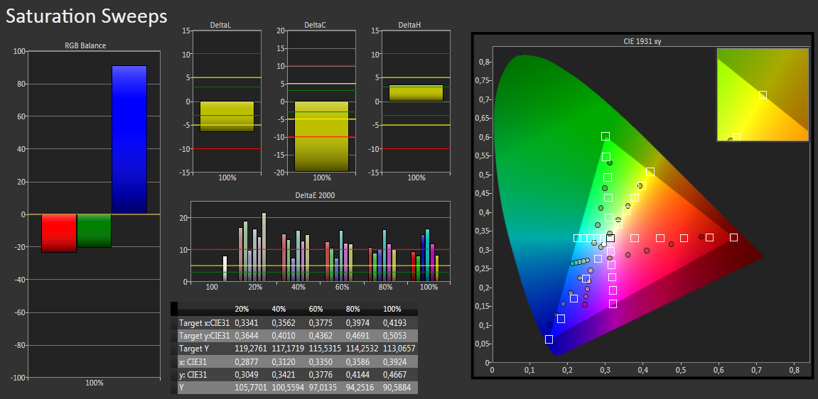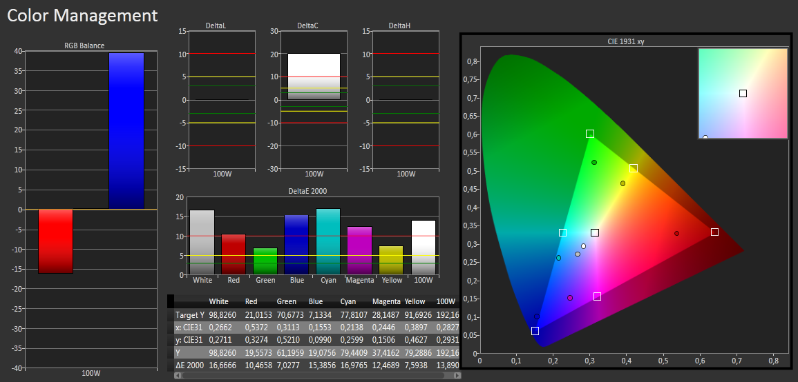Mit einem Schwarzwert von 1,2 bei maximaler Helligkeit verfügt der Bildschirm über einen Kontrast von 195 : 1. Blasse Farben und ein graues Schwarz sind die Folge. Für Office-Aufgaben mag das reichen, Bilder, Videos und Spiele machen so aber nur wenig Spaß. Die Farbgenauigkeit, die Farbsättigung und die Graustufenauflösung liegen weit ab der Normbereiche. Eine Kalibrierung könnte hier Linderung schaffen, haben wir aber dieses Mal nicht durchgeführt, da unser übliches Testgerät nicht erkannt wurde. Mit dem Ersatzgerät konnten wir nur im Nachhinein behelfsmäßig die erforderlichen Werte ermitteln.
