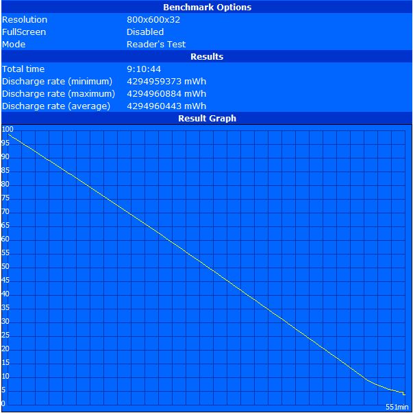 Beim Battery Eater Readers Test (maximale Laufzeit, minimale Displayhelligkeit, Energiesparprofil, Funk aus) erreicht das ThinkPad X230i eine Akkulaufzeit von über 9 Stunden. Da hier das Display mit 4 cd/m² selbst für dunkle Räume viel zu wenig Helligkeit liefert, handelt es sich hier um einen unrealistischen Wert. Beim WLAN-Test (150 cd/m² Displayhelligkeit, Energiesparprofil, WLAN an) werden deutlich praxistauglichere 6 Stunden erreicht. Beim Battery Eater Classic Test (Minimale Laufzeit, maximale Displayhelligkeit, Höchstleistungsprofil, alles an) hält das ThinkPad X230i immer noch gute 2 Stunden lang durch. Für das Aufladen des Akkus von 3 Prozent Restkapazität bis zur vollen Kapazität benötigt das 65-Watt-Netzteil im Höchstleistungsprofil 132 Minuten.