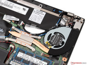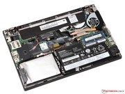 Zur Reinigung des Lüfters oder Aufrüstung des Gerätes konsultiert man am besten zunächst das bereitgestellte Hardware Maintenance Manual, in dem sämtliche (De-)Montageschritte ausführlich erläutert werden. Hier die Kurzfassung: Nach dem Entfernen von 8 Schrauben lässt sich die eingeklippte Bodenplatte vorsichtig abnehmen. Darunter verstecken sich unter anderem der interne 24-Wh-Akku, das 2,5-Zoll-Laufwerk (max. 9,5 Millimeter Bauhöhe), der WLAN-Adapter sowie das einzige Speichermodul. Der freie M.2-Slot für die WWAN-Karte (Antennenkabel vorverlegt) kann alternativ auch mit einer zweiten SSD bestückt werden.