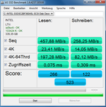 Leichte Enttäuschung macht sich beim Blick auf die Performance-Werte des Datenträgers breit, der auf dem bekannten Sandforce-Controller SF-2281 in Verbindung mit MLC-Speicher von Hynix aufbaut (20 nm). Während sich die sequentiellen Datenraten mit 458 MB/s (Lesen) respektive 258 MB/s (Schreiben) durchaus auf Augenhöhe zu anderen aktuellen SSDs bewegen, fällt die Geschwindigkeit beim Schreiben kleiner 4K-Dateien weit hinter vergleichbare Konkurrenzmodelle zurück.
