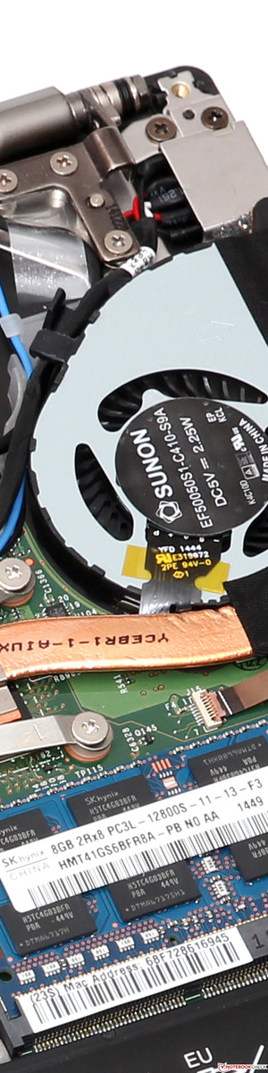 Da Lenovo nur einen einzigen Speicherslot vorgesehen hat, bleibt die maximale Speicherbestückung auf die bereits verbauten 8 GB DDR3L-1600 begrenzt. Ebenfalls ärgerlich: So kann der RAM nur im langsamen Single-Channel-Modus arbeiten, was die Grafikleistung merklich schmälert. Als Datenträger dient eine 360 GB große 2,5-Zoll-SSD.