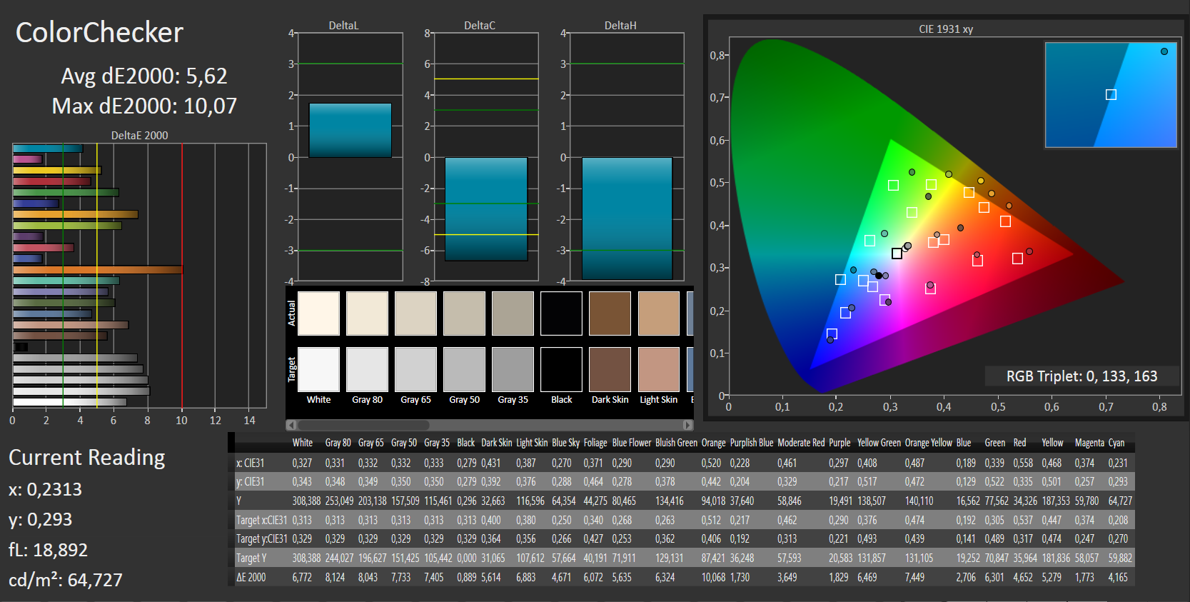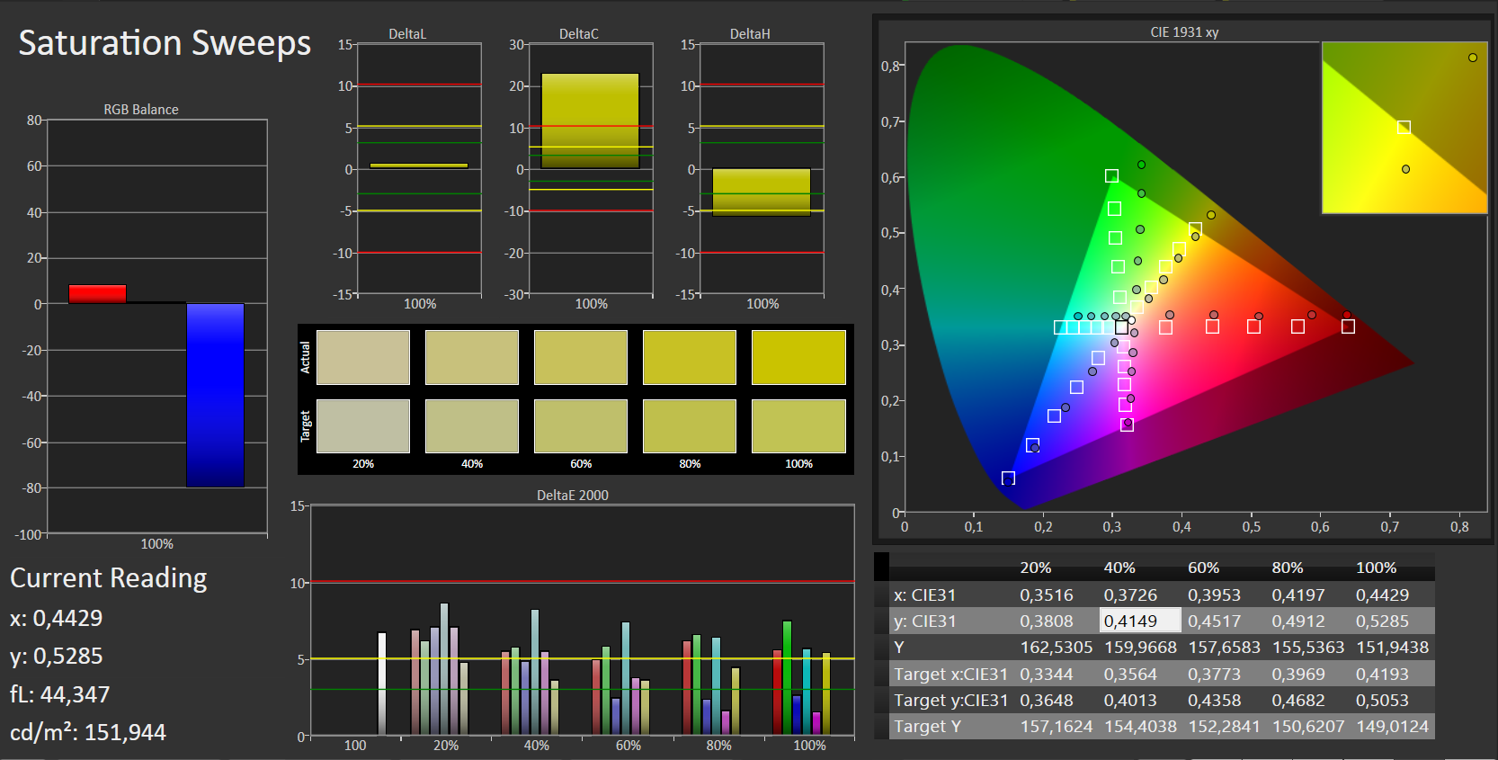 Bei einer genaueren Betrachtung mit dem Spektralfotometer und der Software CalMan wird deutlich, dass Farben einen deutlichen Stich ins Braungelbe haben, was besonders bei hellen Brauntönen auch mit bloßem Auge sichtbar wird. Im Durchschnitt weichen die Farben außerdem zu stark vom Referenzfarbraum sRGB ab, als dass das Display für Profis interessant wäre.