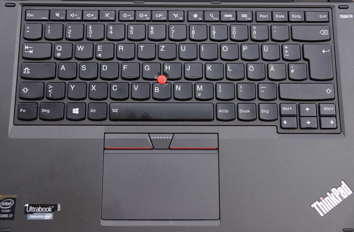 Beim Touchpad hat sich Lenovo glücklicherweise dazu entschieden, die dedizierten Buttons wieder zu integrieren, zumindest für den Track Point, der sich zwischen den Tasten "G", "H" und "B" befindet. Das Touchpad an sich kann entweder auch mit diesen oberhalb liegenden Tasten kombiniert werden oder man verwendet die unteren Ecken, um zu klicken. Die Kombination aus Clickpad und dedizierten Tasten geht in Ordnung, allerdings sind die Tasten ein wenig zu leichtgängig, wir haben sie schon mal aus Versehen betätigt, weil der Widerstand zu gering war.