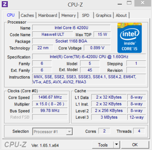Der neue Low-Voltage Core i5-4200U ist ein Zweikern-Prozessor mit einem Basistakt von 1,6 GHz (Turbo Boost bis zu 2,6 GHz) und einer TDP von 15 Watt. Leistungstechnisch schlägt sich die CPU gut gegen seinen Vorgänger i5-3317U, der mit 1,7 GHz etwas höher getaktet war und zudem etwas mehr Strom verbrauchte (17 Watt TDP). Cinebench R11.5 zeigt einen leichten Vorteil für den i5-4200U: Während unser Testgerät im Multi Test 2,5 Punkte erzielt, erreichte das ThinkPad Helix, welches den älteren Ivy-Bridge-Prozessor verwendet, rund 5 % weniger mit 2,38 Punkten. Das Dell XPS 12 verwendet den gleichen Prozessor wie unser Testgerät und kommt dementsprechend auf ein ähnliches Ergebnis (2,48 Punkte).