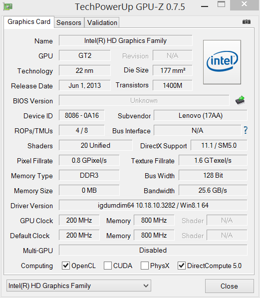 Bei der Grafik vertraut Lenovo auf die integrierte Intel HD Graphics 4400 mit einem Takt von 200 bis 1.000 MHz (Turbo Boost). Während unserer Benchmarks stellten wir fest, dass das ThinkPad Yoga den maximalen Turbo-Takt unter Last nicht aufrechterhalten kann – ein bekanntes Problem von vielen Notebooks. Bei FurMark beispielsweise fällt der GPU-Takt schnell auf 700 MHz. Wir werden uns das Problem im Kapitel "Stresstest" noch genauer ansehen.