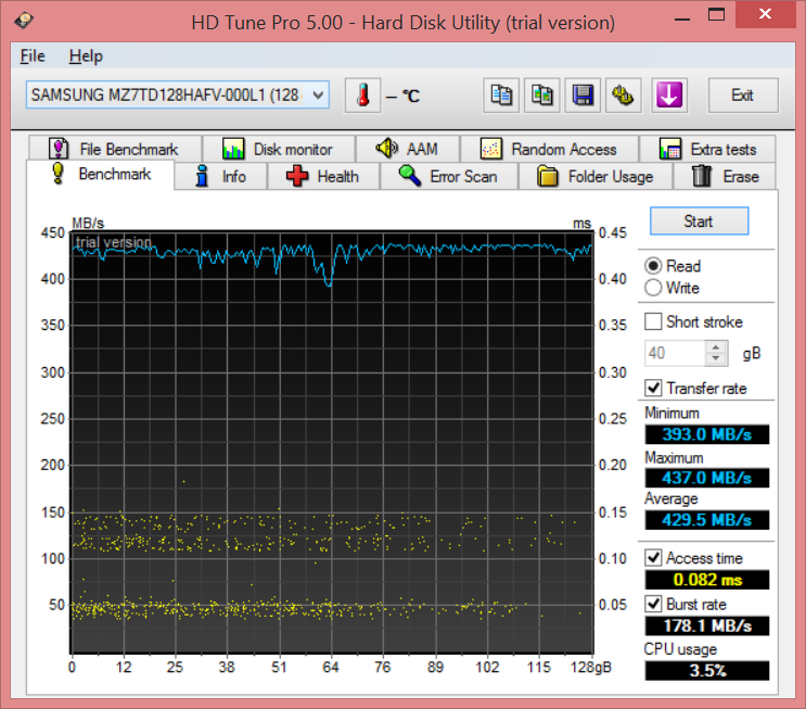 Laut CrystalDiskMark bietet die 128-GB-SSD von Samsung (PM841 MZ7TD128HAFV-000L1) sehr gute Leseraten, aber keine überwältigenden Schreibraten mit 525 MB/s bzw. 136 MB/s. Die durchschnittliche Transferrate von 430 MB/s ist ebenfalls sehr gut und übertrifft die mSATA-SSD im Dell XPS 12 (366 MB/s) und auch im Sony Vaio Duo 13 (308 MB/s). Auch die 4K-Leistung ist mit 31 MB/s (Lesen) und 93 MB/s (Schreiben) exzellent.
