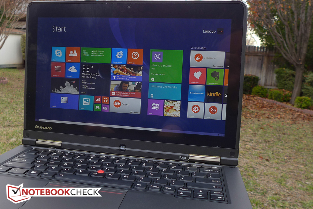 Obwohl wir keine genauen Informationen zu dem Display auf Lenovos Webseite finden konnten, steht es außer Frage, dass das ThinkPad Yoga eine reflexionsarme Beschichtung hat. Im Gegensatz zu typischen spiegelnden Anzeigen sind die Spiegelungen deutlich reduziert und damit selbst bei geringeren Helligkeitsstufen (um Akkuleistung zu sparen) kein großes Problem mehr. An einem bewölkten Tag konnten wir das Ultrabook ohne Einschränkungen im Freien verwenden.