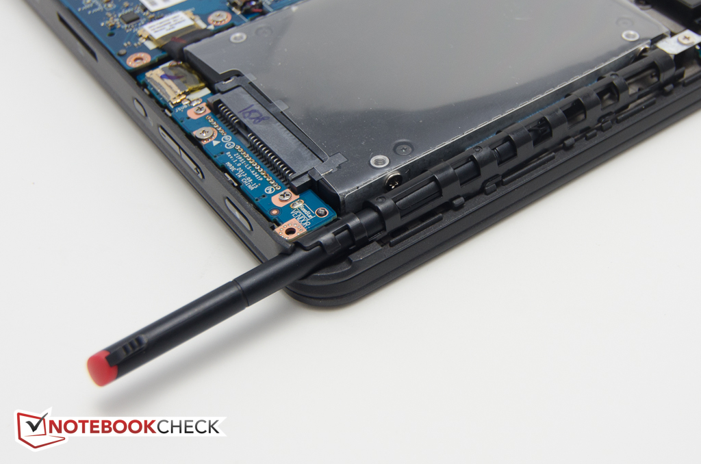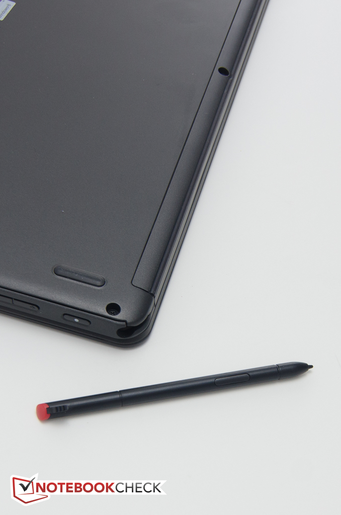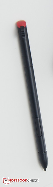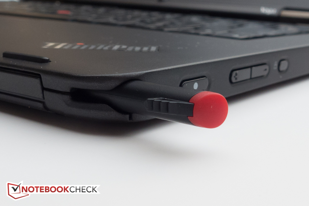Lenovo bietet für das ThinkPad Yoga einen Wacom Digitizer-Pen an, der vorne rechts im Gehäuse verstaut werden kann. Der Digitizer ist recht schmal und bei längeren Einsätzen auch nicht sehr komfortabel. Die Kappe des Digitizers ist zwar rot, allerdings gibt es keine Löschfunktion, die normalerweise bei größeren Stiften vorhanden ist. Mit der neuesten Windows Ink-Collection-API unterstützen Programme wie Fresh Paint (frei im Windows Store verfügbar) oder Microsoft OneNote den drucksensitiven Stift ohne weitere Zusatzsoftware (1.024 Stufen werden unterstützt). Andere Programme, z. B. Adobe Photoshop, könnten noch zusätzliche Treiber benötigen. Während unseres Tests arbeitete der Digitizer zuverlässig, wies nur eine geringe Abweichung auf (nicht weiter ungewöhnlich für Wacom Digitizer), und es gab praktisch keine Verzögerung. Auch das Ignorieren der Handflächen funktionierte ganz gut, was nicht immer selbstverständlich ist.