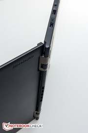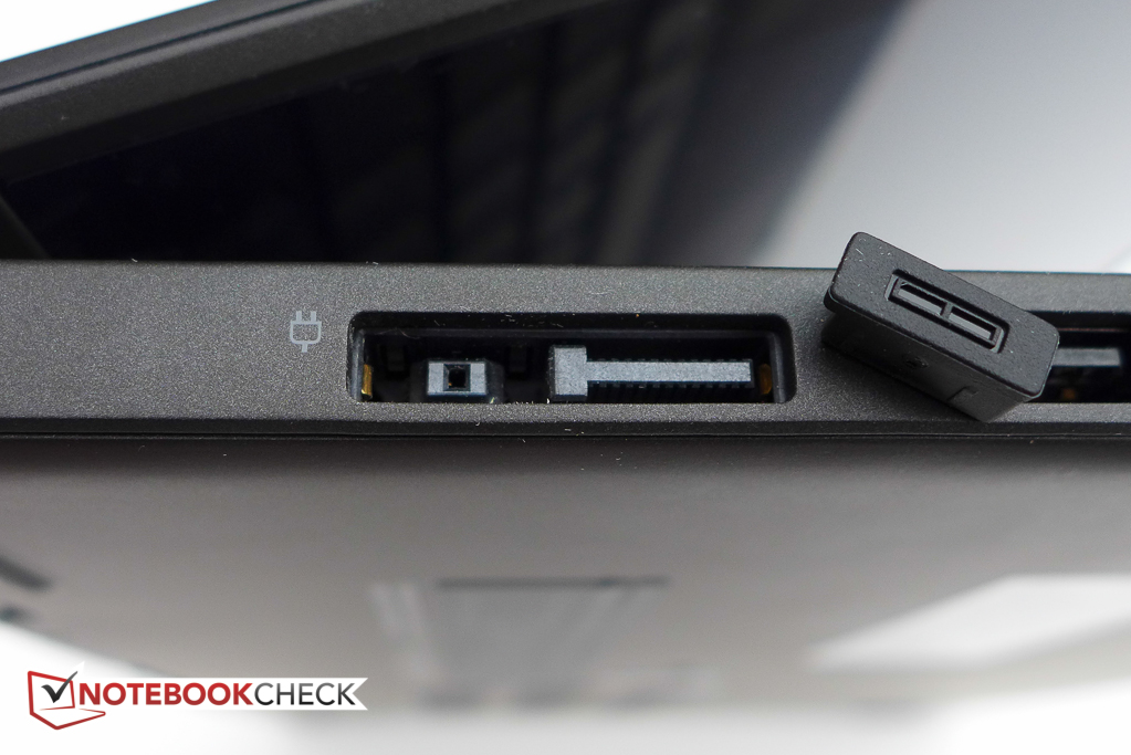 Für Benutzer, die auf einen Ethernet-Anschluss angewiesen sind, bietet Lenovo das optionale ThinkPad OneLink Dock an. Dieses stellt 2x USB 3.0, einen kombinierten Audioanschluss, 2x USB 2.0, einen normalen HDMI-Ausgang und den erwähnten Ethernet-Anschluss zur Verfügung. Das OneLink Dock verwendet einen speziellen Anschluss auf der linken Seite neben dem Netzteilanschluss. Solange dieser Anschluss nicht verwendet wird, ist er durch einen Gummieinsatz geschützt.